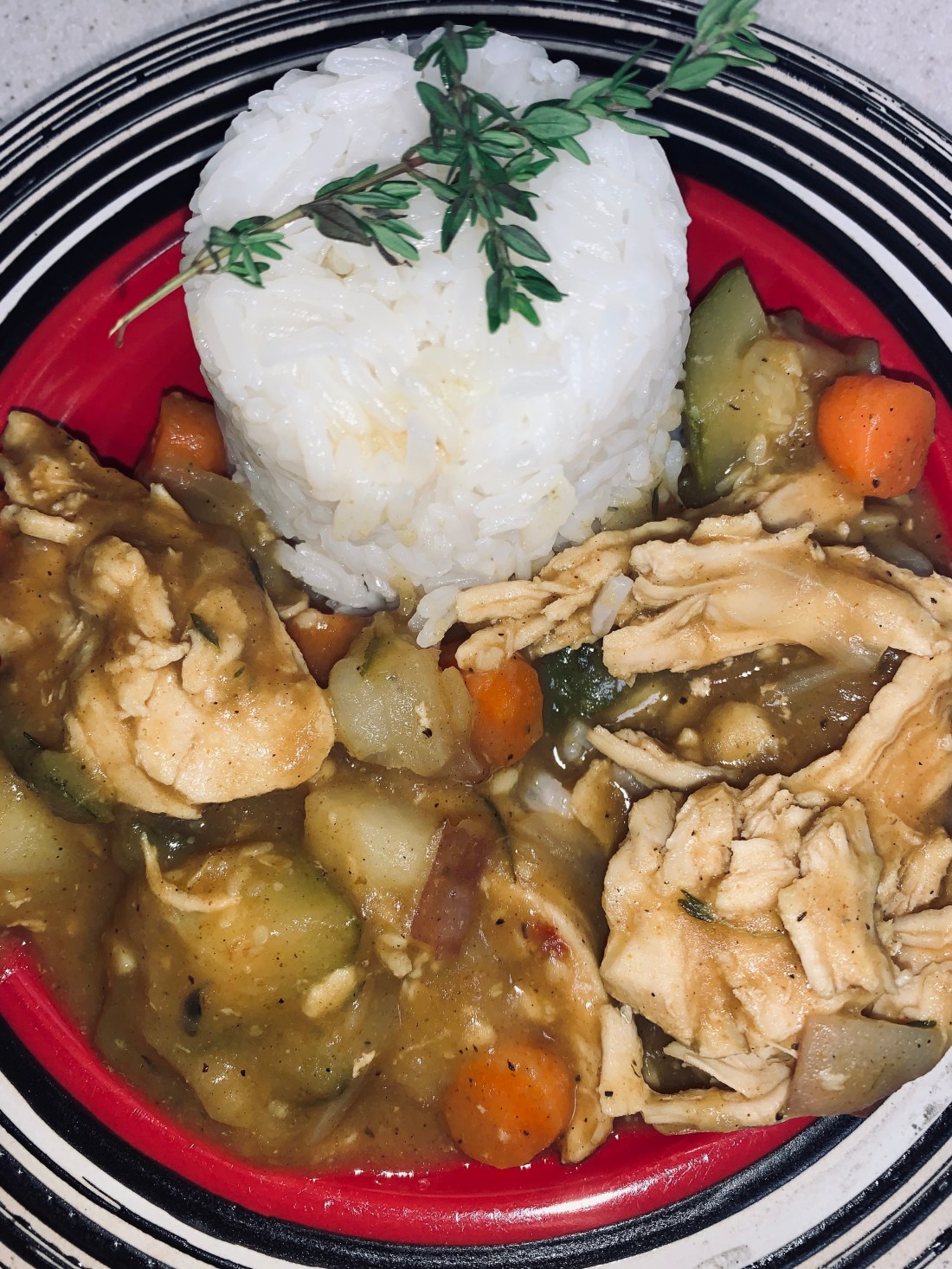 First pre-heat skillet on medium heat until hot. Add any type oil you prefer to pan. Once pan is hot, add onion, chopped carrots, and chopped potato. Add salt and pepper. Saute for 6-8 minutes until the onions are soft, then add in chopped garlic and butter and cook for about a minute while stirring constantly. Add 1 1/4 cup water, thyme, and add seasoned chicken. Cover and let simmer for 10-15 minutes until the veggies are soft and the chicken is cooked. I flipped the chicken every 5 minutes. After the chicken is cooked, take out and cut (if you prefer) and return to the pan. Turn off the stove and add in Golden Japanese Curry bricks. Stir constantly while curry base melts for about 5 minutes. Add salt and pepper if needed. Serve with rice 🙂