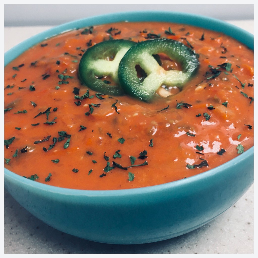 Preheat oven to 350 degrees. Add tomatoes, onions, garlic and jalapeño to pan. Cut the onion in half and cut the jalapeño in half and remove the seeds before adding. Add oil, salt and pepper and mix. Bake for 20 minutes. Next, add the baked veggies to a blender or a food processor (I used a blender). Add lime and cilantro and pulse until smooth but chunky 😍 that’s it!